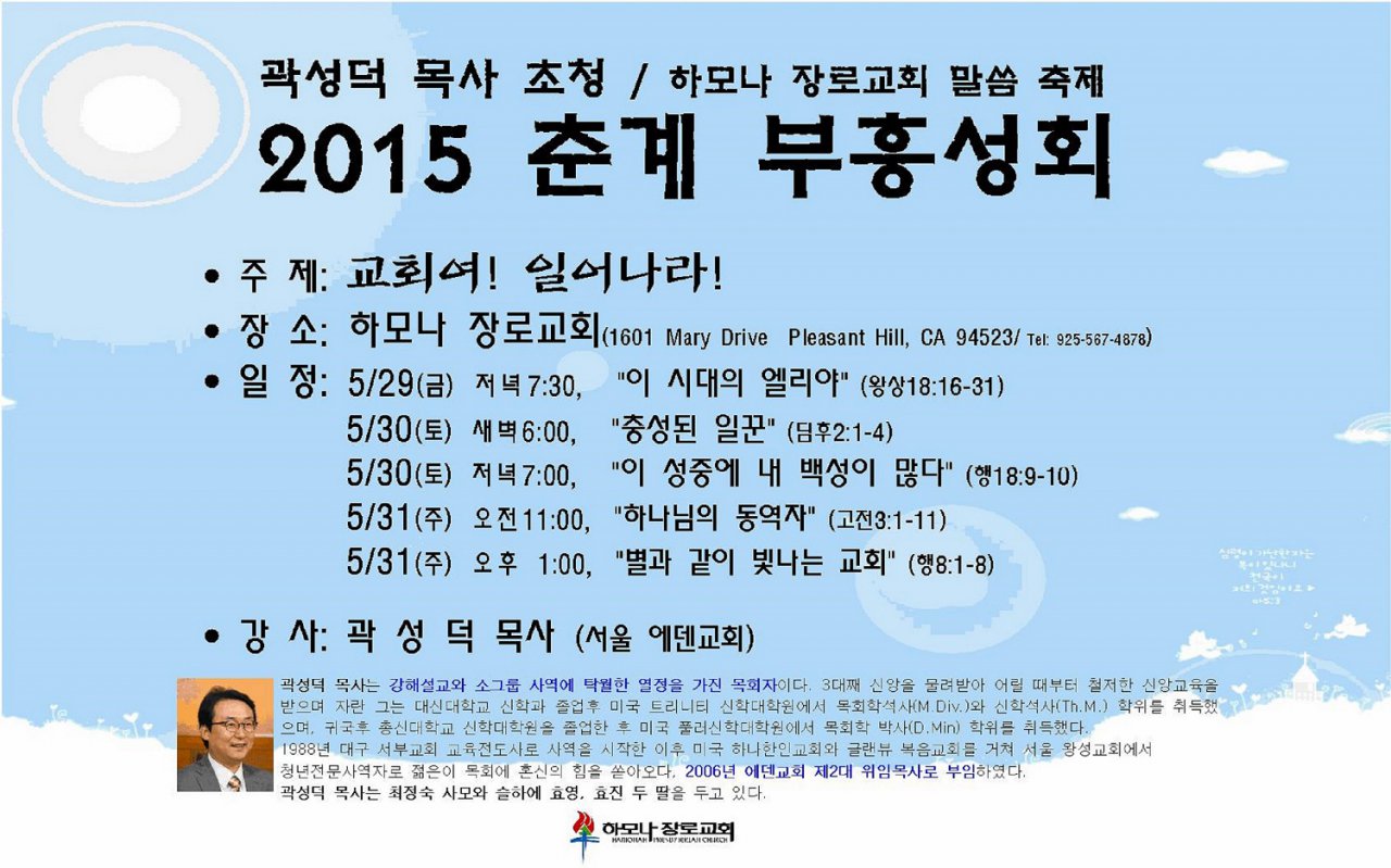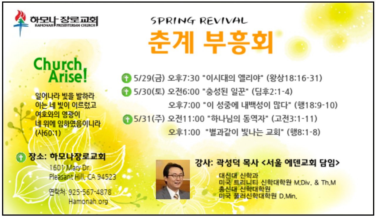 저희 하모나장로교회 말씀축제가 5월 곽성덕 목사님(서울 에덴교회)을 모시고,