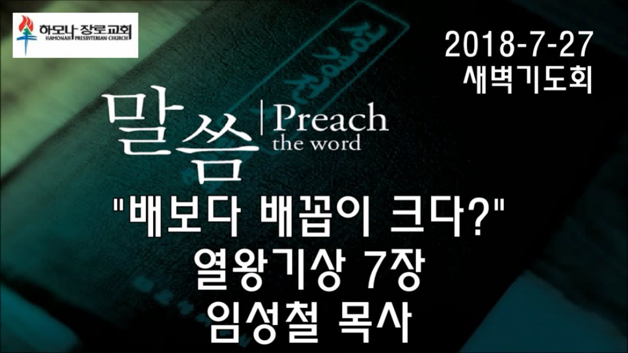 2018-7-27, "배보다 배꼽이 크다?", 열왕기상 7장, 새벽기도회, 하모나장로교회, 임성철 목사