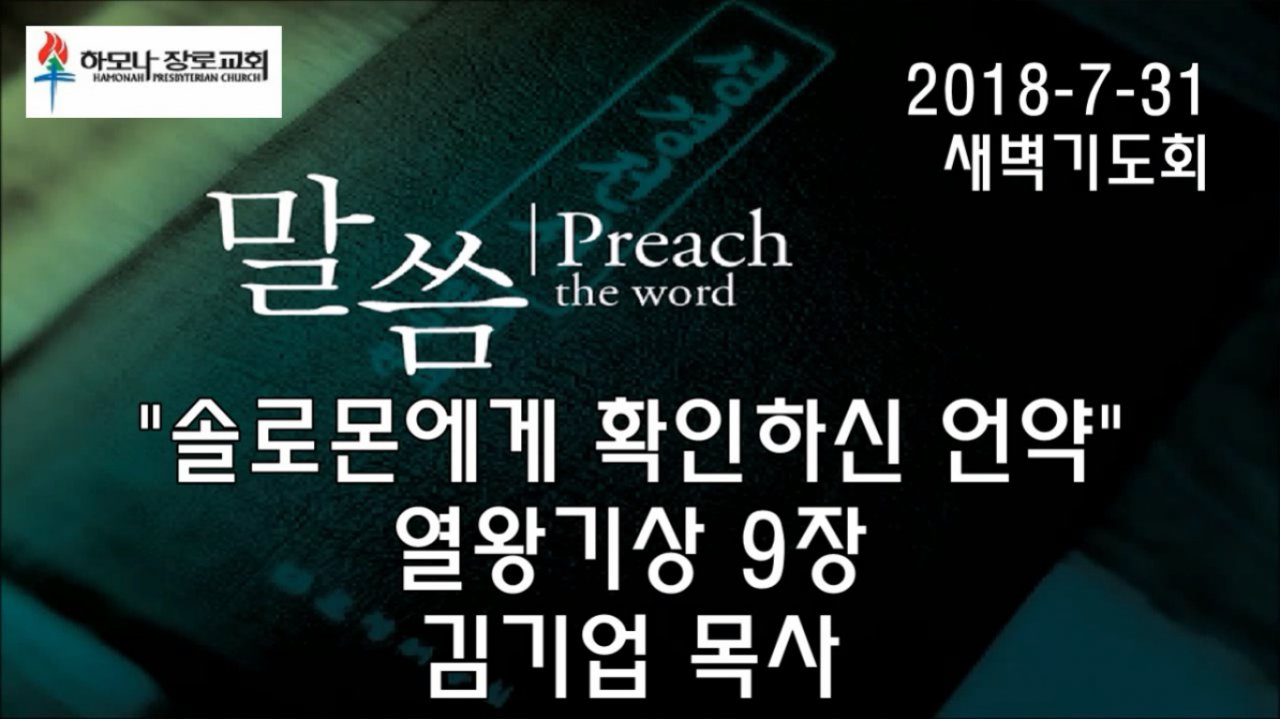 2018-7-31, "솔로몬에게 확인하신 언약", 열왕기상 9장, 새벽기도회, 하모나장로교회, 김기업 목사