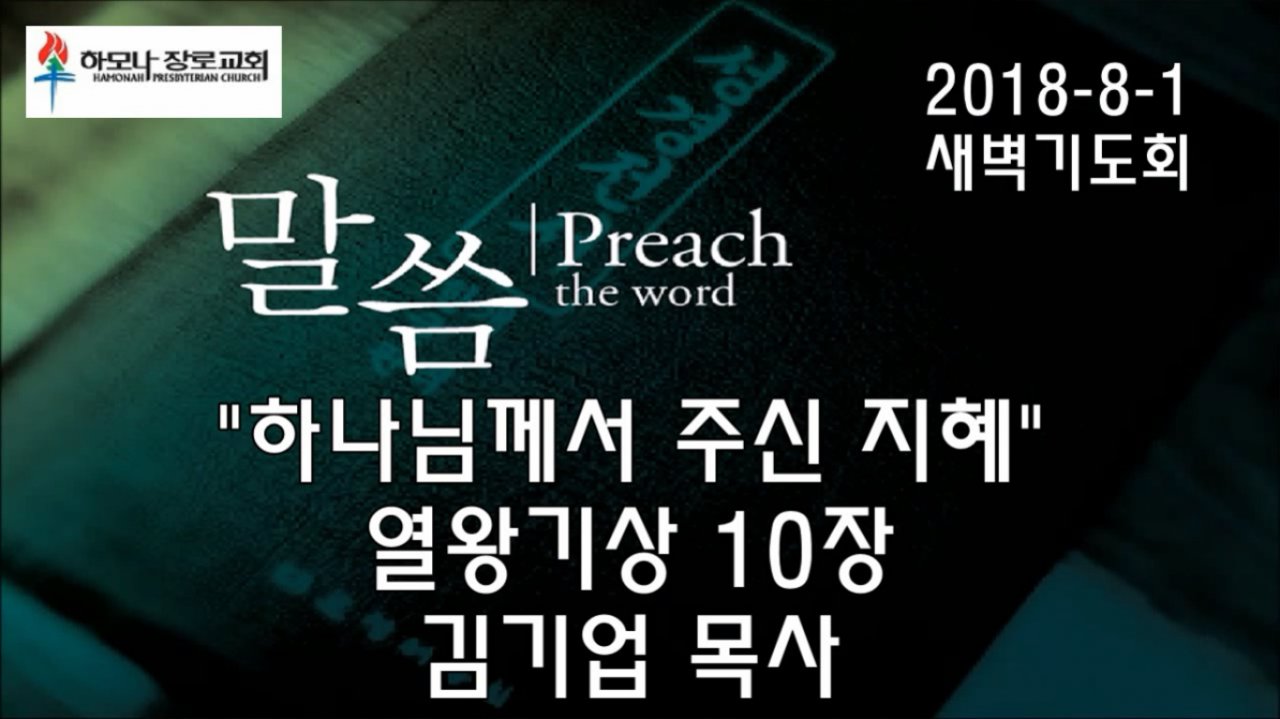 2018-8-1, "하나님께서 주신 지혜", 열왕기상 10장, 새벽기도회, 하모나장로교회, 김기업 목사